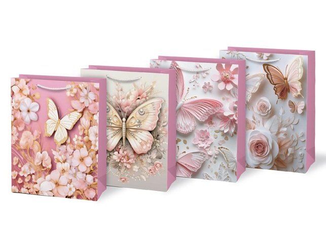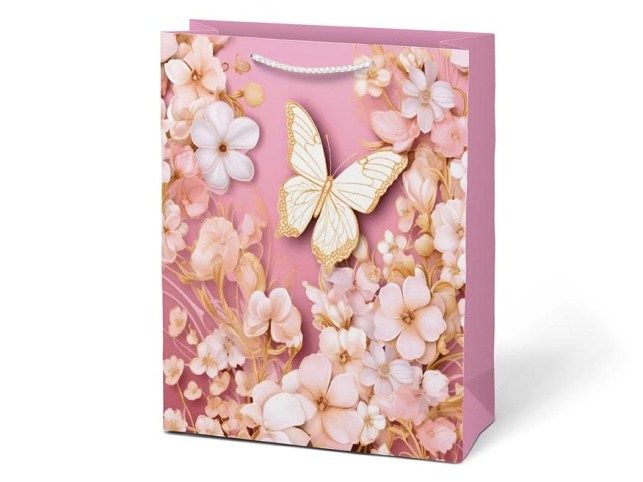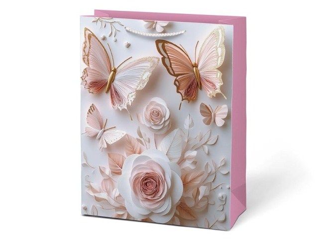 Darovat může být stejně krásné jako dostávat. Dárková papírová taška MFP M LUX v sobě spojuje něžnost i eleganci. Jemné motivy motýlů a květů v odstínech růžové, bílé a zlaté působí romanticky a slavnostně. Díky svému provedení nabízí jednoduchý, ale vkusný způsob balení – dárek do ní stačí vložit a je připraven k předání. Pletená ucha ladí s barvou tašky a dotvářejí její jemný, ucelený vzhled. Motiv: květy, motýli Rozměry: 180 x 230 x 100 mm Uvedená cena je za 1 ks.