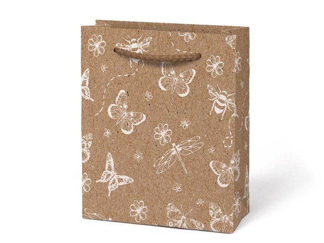Dárková taška S LUX KRAFT je důkazem, že i balení může být umělecké! Jemné bílé kresby na přírodním kraftovém papíru a pevná uchy z provázku dodají každému dárku originální šmrnc. Promění každý dárek v elegantní překvapení, které potěší ještě dřív, než se dostanete k obsahu! Stylová, jednoduchá a plná kouzla – ideální pro každou příležitost! MOTIV: - srdce - leknín - vážky, motýli, včely - květy Barva: hnědá/přírodní Materiál: kraftový papír Rozměr: 110 x 135 x 65 mm Uvedená cena je za 1 ks.