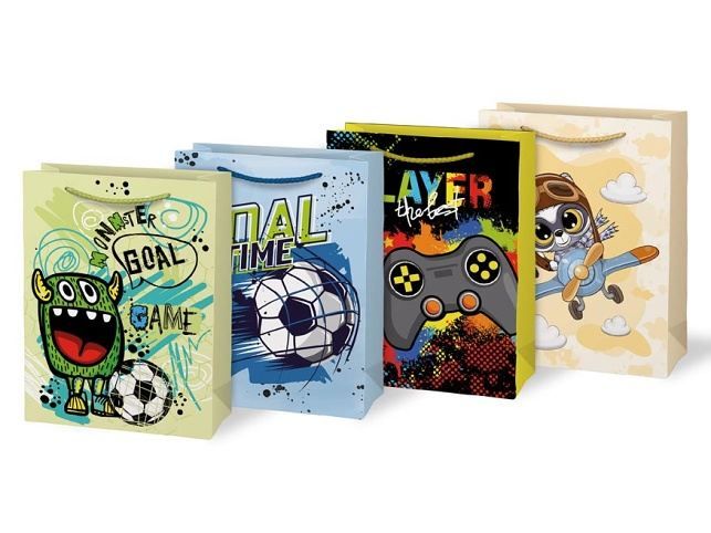 Papírová dárková taška. Každý dárek musí být v něčem zabalený. Pokud nemáte čas balit ho do balicího papíru, máme pro Vás na výběr nejrůznější dárkové tašky. MOTIVY: pro kluky, letadlo, hry, gamepad, fotbal, monster Taška má pevné ucho pro snadné přenášení a štítek pro vepsání jména či přání. Uvedená cena je za 1 ks.