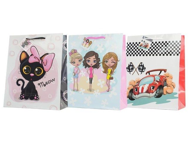 Dárková papírová taška T4 s dětskými motivy. Taška je opatřena pevným uchem pro snadné nošení a kartičkou kam můžete napsat jméno nebo krátké věnování. Pokud nemáte čas balit dárek do dárkového balícího papíru tak právě pro Vás máme široký výběr dárkových tašek. MOTIV: - kočka - dívky - závodní auto Rozměr: 180 x 230 x 100 mm Uvedená cena je za 1 ks.