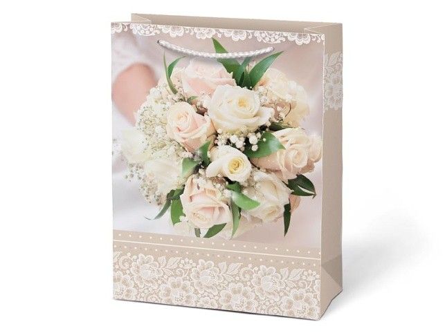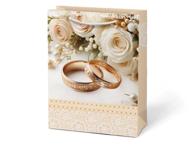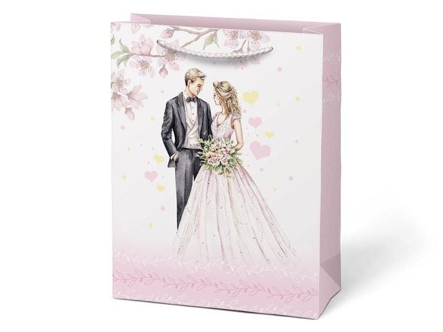 Dárková papírová taška T4 se svatebním motivem. Představujeme vám naši exkluzivní svatební dárkovou tašku, která je navržena tak, aby vaše dary pro novomanžele byly prezentovány s elegancí a stylem. Výběrem dárkové tašky místo balicího papíru můžete ušetřit čas a zvýšit estetickou hodnotu daru. Dárková taška umožňuje rychlé a snadné zabalení daru bez nutnosti zdlouhavého balení do balicího papíru. Motiv: svatební Rozměr: 190 x 250 x 100 mm Uvedená cena je za 1 ks.