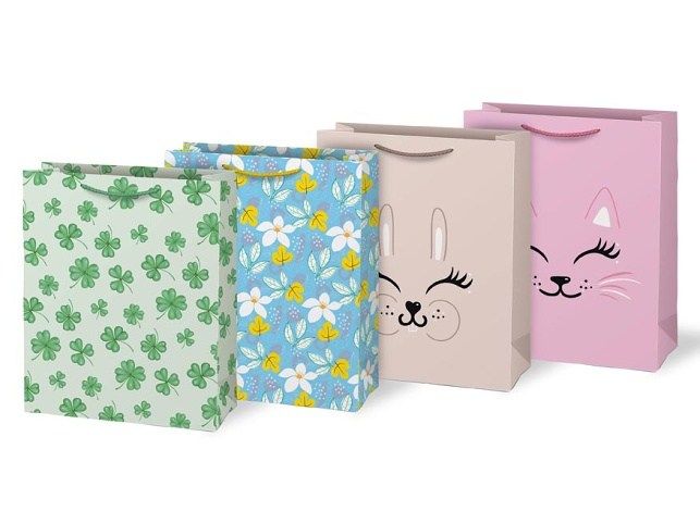 Kouzlo v každém detailu! Překvapte své blízké stylově! Tato prostorná dárková taška zaujme veselým a hravým designem, který okouzlí děti i dospělé. V mixu motivů – roztomilý zajíček, usměvavá kočička, jemné květy i čtyřlístky pro štěstí – si každý najde svého favorita. Taška je vyrobena z pevného papíru a doplněna o praktická textilní ucha, která usnadňují přenášení. Díky větším rozměrům se do ní vejde i objemnější dárek. Rozměr: 260 × 320 × 138 mm Motiv: čtyřlístky, květiny, králíček, kočička Cena je uvedena za 1 ks.