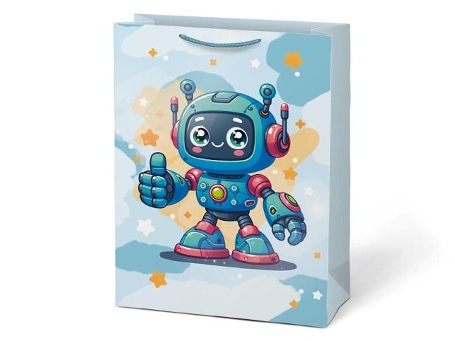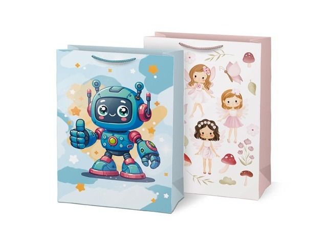 Dárková papírová taška T14 s dětským motivem ve dvou různých designech. Na výběr je jeden dívčí a jeden chlapecký motiv. Je ideální pro předání dárku na oslavě narozenin, vysvědčení nebo jiné významné události. Tato dárková taška zaujme svým vzhledem a zároveň potěší každé dítě. Takto zabalený dárek udělá radost a vytvoří nezapomenutelný zážitek. Pohodlná ucha jsou z pevného materiálu, která zajišťují snadné přenášení. Motiv: robot, víly Barva: modrá, růžová Rozměr: 405 x 555 x 205 mm Uvedená cena je za 1 ks.