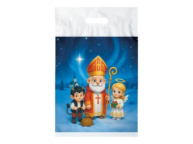Tradiční mikulášská dárková taška nesmí chybět při žádné nadílce. Nabízí opravdu velký prostor pro všechny dobroty, které Mikuláš, anděl a čert přinášejí. Díky rozměru větší velikosti se do ní snadno vejdou čokolády, ovoce, perníčky i menší dárky. Hodí se nejen pro domácí použití, ale také pro školy, školky nebo firemní akce pro děti. Materiál: PE Rozměr: 300 x 460 x 80 Praktické balení: odtrhávací blok Uvedená cena je za 1 ks.