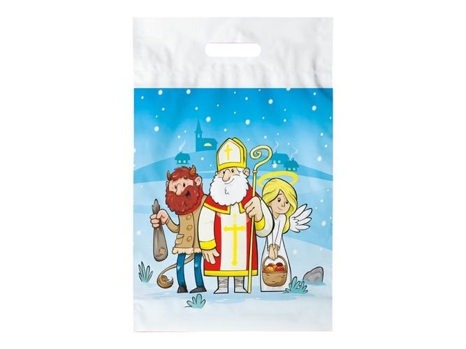 Igelitová taška s průhmatem v Mikulášském motivu. Rozměr: 30x46x8 Materiál: PE Uvedená cena je za 1 ks. Všech 50 ks je balených v sáčku.