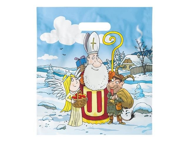 Igelitová taška s průhmatem v Mikulášském motivu. Na tašce je obrázek Mikuláše, anděla, čerta a vánočních dárků. Rozměr: 29,5x32x8 Materiál: PE Uvedená cena je za 1 ks.