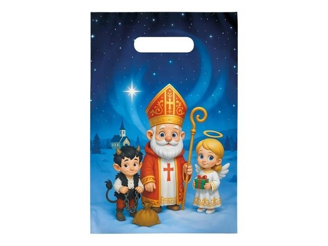 Krásné balení pro sváteční překvapení! Vneste do svátečního období kouzlo tradiční mikulášské nadílky s originální mikulášskou dárkovou taškou, která potěší malé i velké. Tento veselý motiv Mikuláše, anděla a čertíka na zasněženém pozadí pod hvězdnou oblohou rozzáří každý balíček a dodá mu tu pravou sváteční atmosféru. Taška je ideální pro balení sladkostí, ovoce nebo malých dárků. Díky praktickému průhmatu se snadno přenáší a skvěle poslouží při mikulášské nadílce doma i ve školních kolektivech. Materiál: PE Rozměr: 200 x 300 x 80 Praktické balení: odtrhávací blok Uvedená cena je za 1 ks.