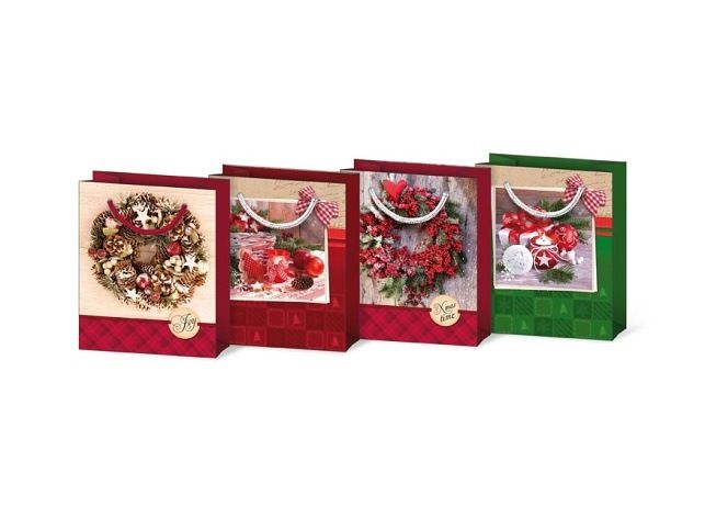 Papírová dárková taška s vánočními motivy Taška má pevné ucho pro snadné přenášení a štítek pro vepsání jména či přání. Povrchová úprava: Lak Gramáž: 157 g Uvedená cena je za 1 ks.