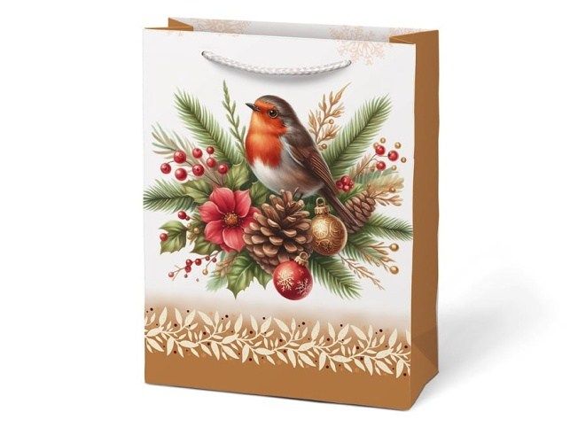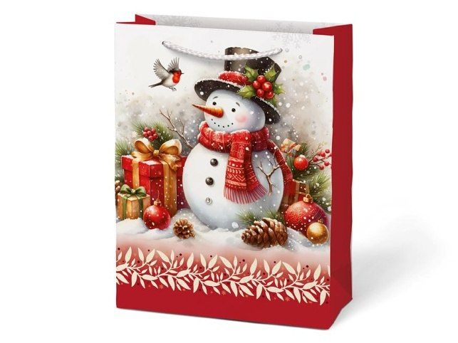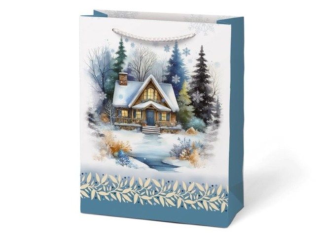 Vánoční dárková papírová taška T4 s vánočními motivy je dokonalým spojením elegance a praktičnosti. Taška je vhodná na balení všech druhů dárků, od malých překvapení po větší předměty, a přidává jim kouzlo sváteční atmosféry. Je skutečně nepostradatelným pomocníkem, když se balení dárku do klasického balicího papíru zdá být příliš obtížné. Její robustní ucha zajišťují pohodlné a bezpečné přenášení. Rozměr: 190 x 250 x 90 mm Motiv: zasněžená chalupa, vánoční lucerna, ptáček na větvi, sněhulák Uvedená cena je za 1 ks.