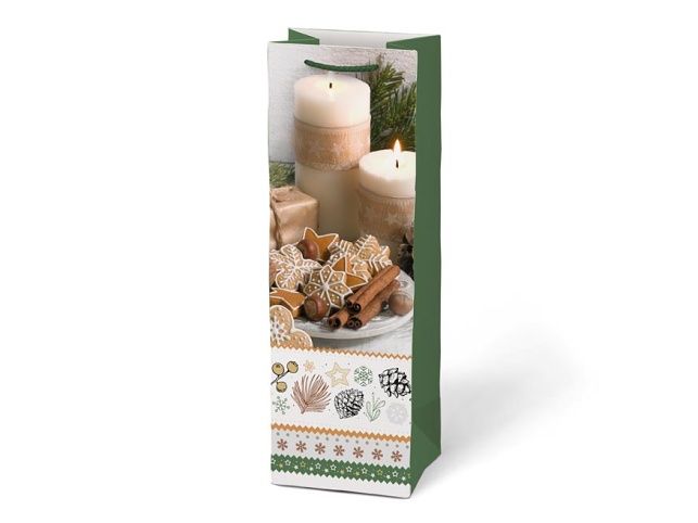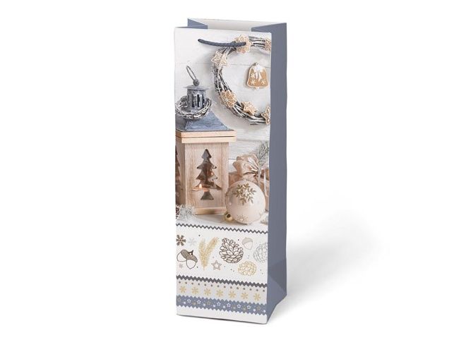 Vánoční dárková papírová taška T12 na víno nebo jinou lahvinku. Taška je opatřena pevným uchem pro snadné nošení. Motiv: mix vánočních motivů Rozměr: 120 x 360 x 100 mm Uvedená cena je za 1 ks.