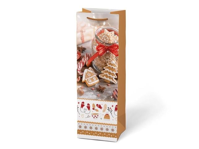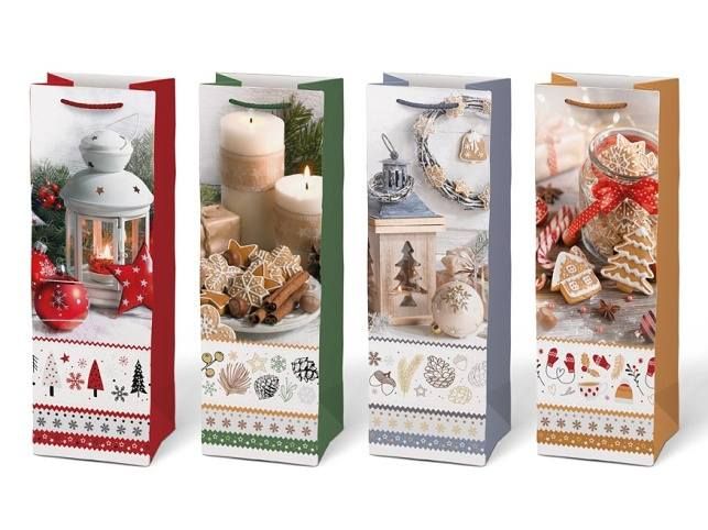Vánoční dárková papírová taška T12 na víno nebo jinou lahvinku. Taška je opatřena pevným uchem pro snadné nošení. Motiv: mix vánočních motivů Rozměr: 120 x 360 x 100 mm Uvedená cena je za 1 ks.