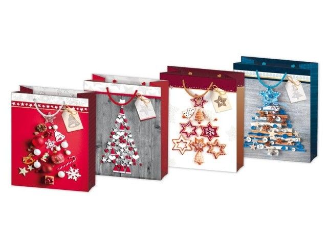 Papírová dárková taška s vánočními motivy Taška má pevné ucho pro snadné přenášení a štítek pro vepsání jména či přání. Povrchová úprava: Lak Gramáž: 157 g Uvedená cena je za 1 ks.