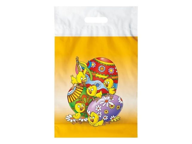 Igelitová taška s průhmatem s velikonočním motivem kuřátek a velikonočních vajíček - Ideální pro vytváření čokoládových balíčků pro děti! Materiál: Polyethylen Tloušťka materiálu: 0,045 my Tisk: 4+0cmyk