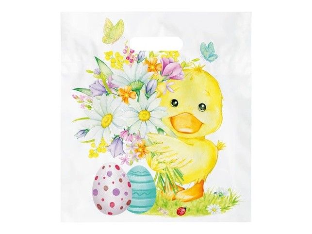 Igelitová taška s průhmatem s velikonočním motivem kraslic, kachňátka a květin. Ideální pro vytváření čokoládových balíčků pro děti! Tisk: 4+0 cmyk Materiál: Polyethylen Rozměr: 290 x 320 x 80 mm Tloušťka materiálu: 0,045 my Uvedená cena je za 1 ks.