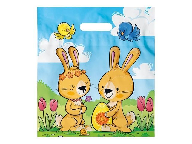 Velikonoční igelitová taška s potiskem velikonočních zajíčků - Ideální pro vytváření čokoládových balíčků pro děti! Materiál: Polyethylen Tloušťka materiálu: 0,045 my Tisk: 4+0cmyk Uvedená cena je za 1 ks.
