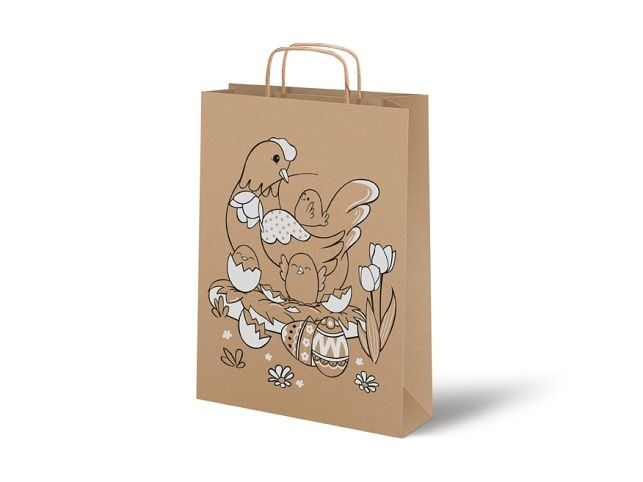 Velikonoční dárková papírová taška s motivem slepičky, kuřátka a velikonočního vajíčka. Ideální na velikonoční nadílku malé i velké koledníky.