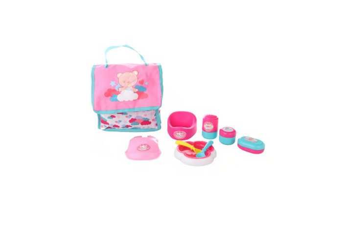 Taštička s doplňky pro panenky. Balení obsahuje taštičku, plastový bryndáček, nočník, talířek a další doplňky. Rozměry balení cca 27 x 30 x 5 cm. Věk 3+