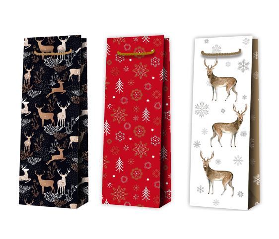 - vánoční dárková taška v provedení UV lak, papír 157g, ucha z bavlněné šňůrky- rozměr 12,5 x 36,5 x 9, cm- mix vzorů
