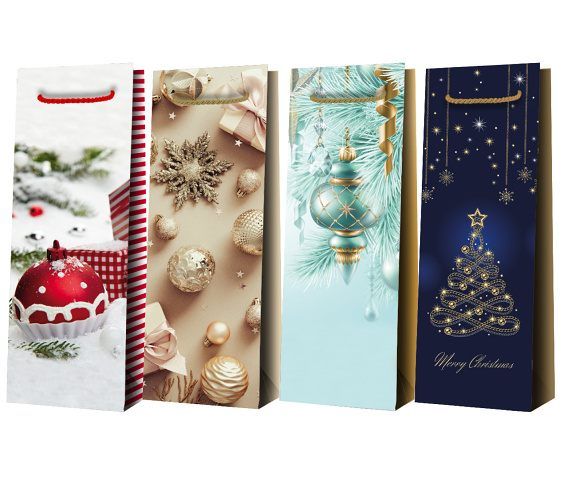 Vánoční dárková taška na lahev- UV lak- ucha z bavlněné šňůrky- rozměr: 10 x 22 x 5,5cm- gramáž: 128g/m2