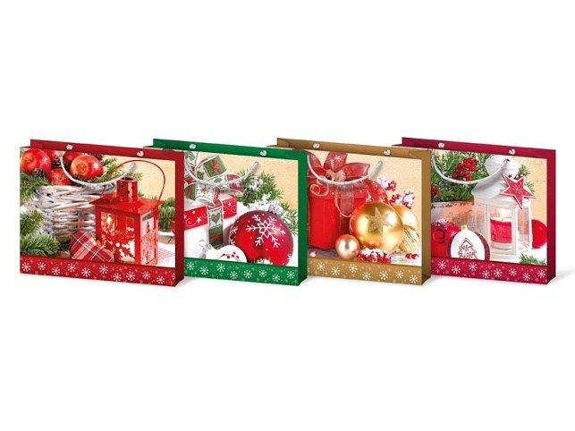 Papírová dárková taška s vánočními motivy Taška má pevné ucho pro snadné přenášení a štítek pro vepsání jména či přání. Povrchová úprava: Lak Gramáž: 157 g Uvedená cena je za 1 ks.