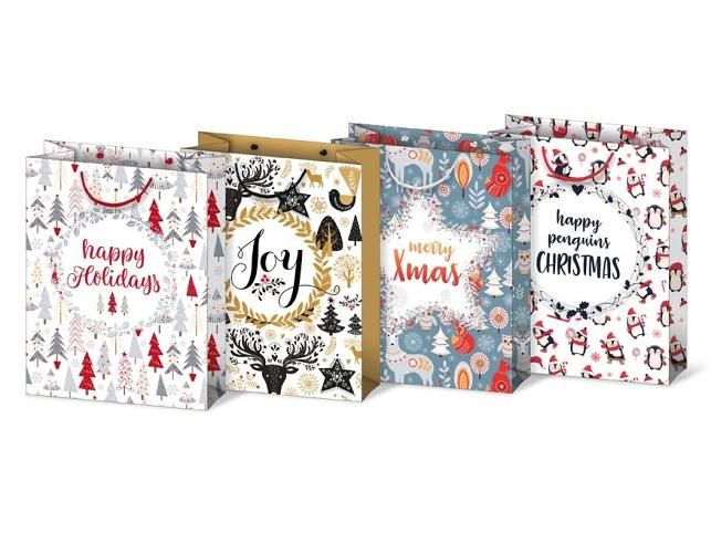 Papírová dárková taška s vánočními motivy a nápisy happy Holidays, Joy, merry Xmas, happy penguins Christmas Taška má pevné ucho pro snadné přenášení a štítek pro vepsání jména či přání. Povrchová úprava: Lak Gramáž: 157 g Uvedená cena je za 1 ks.