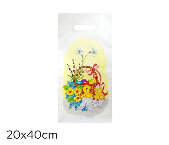 Igelitová taška s velikonočním motivem- proseklé ucho- složené dno má hloubku 6cm- potisk na přední straně- fólie je určena pro přímý styk s potravinami, zdravotně nezávadná- rozměr: 20 x 40cm