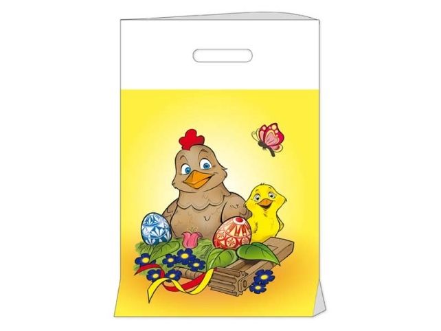 Igelitová taška s průhmatem s velikonočním motivem slepičky, kuřátka a velikonočních vajíček - Ideální pro vytváření čokoládových balíčků pro děti! Materiál: Polyethylen Tloušťka materiálu: 0,045 my Tisk: 4+0cmyk