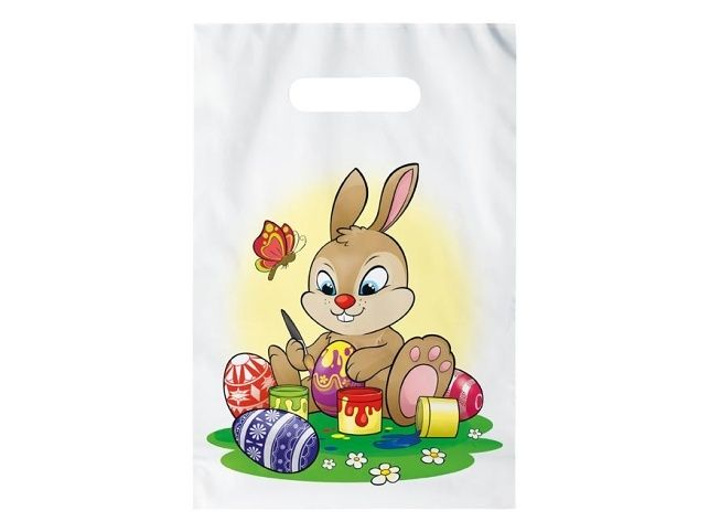 Igelitová taška s motivem velikonočního zajíčka - Ideální pro vytváření čokoládových balíčků pro děti! Materiál: Polyethylen Tloušťka materiálu: 0,045 my Tisk: 4+0cmyk
