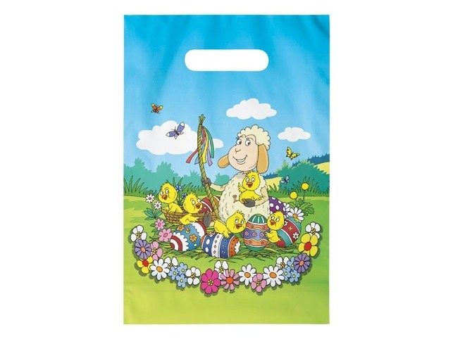 Igelitová taška s průhmatem a velikonočním motivem ovečky, kuřátek a velikonočních vajíček - Ideální pro vytváření čokoládových balíčků pro děti! Materiál: PVC Tloušťka materiálu: 0,045 my Tisk: 4+0cmyk