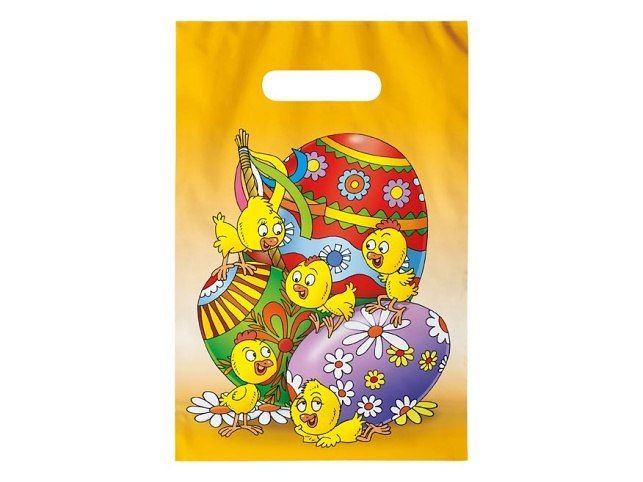 Igelitová taška s průhmatem a velikonočním motivem kuřátek a velikonočních vajíček - Ideální pro vytváření čokoládových balíčků pro děti! Materiál: Polyethylen Tloušťka materiálu: 0,045 my Tisk: 4+0cmyk