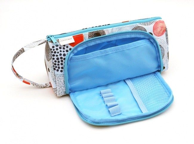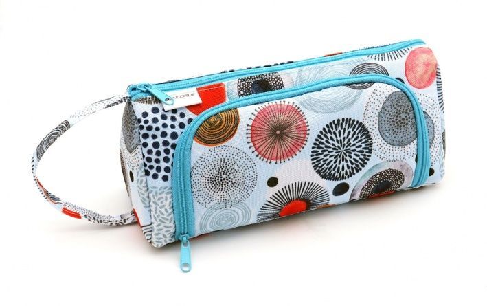 Designová taštička s abstraktním vzorem a postranní kapsičkou. Objemný odkládací prostor uzavíratelný na zip. Taštička je vhodná na kancelářské a školní potřeby, ale i kosmetiku nebo další nezbytnosti. Vnitřní odkládací prostor obsahuje tři malé otevřené kapsičky vhodné na malé drobnosti. Postranní kapsa uzavíratelná na zip disponuje 5 smyčkami na psací potřeby. Rozměr taštičky 22x8x10 cm.