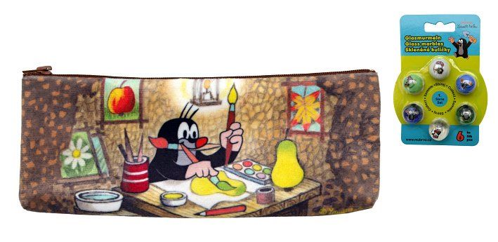 Látková taštička na zip s motivem Krtečka a jeho kamarádů. Omyvatelný vnitřek usnadňuje údržbu. Možno použít jako pouzdro na psací potřeby či jako toaletní taštičku. Bonus: sada 6ks barevných skleněných kuliček s motivy Krtečka.