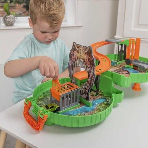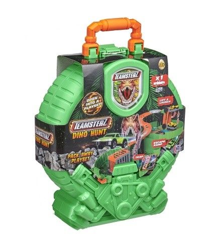Hrací set v designu dinosaurů je v praktickém kufříku/pneumatice s jedním autíčkem. Herní set je díky rukojeti lehce přenosný. Set má výtah, klec, parkovací prostory a únikovou rampu. Napomáhá rozvoji kognitivních schopností a jemné motoriky. Dokonalá velikost pro hraní, která nabízí hodiny zábavy. Vhodné pro děti od 3 let.