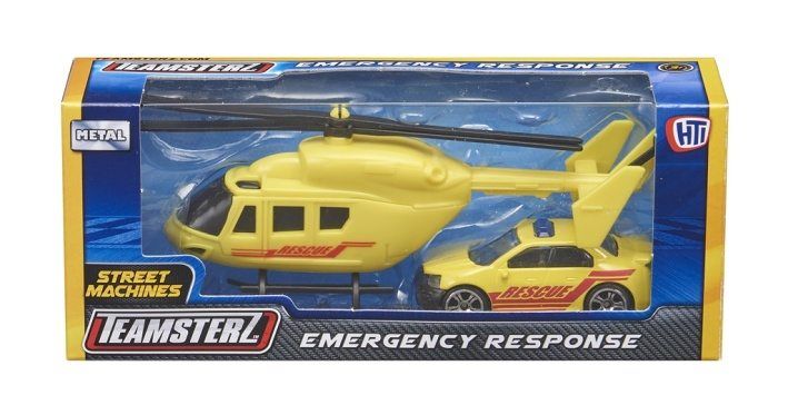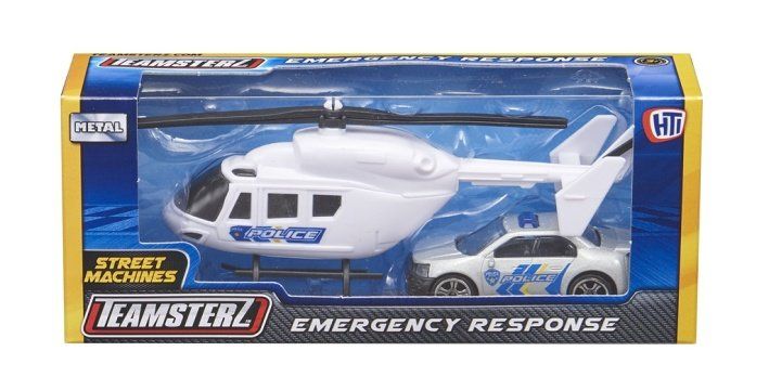 Sada obsahuje vrtulník s ručně otáčejícími se listy vrtule a zásahové auto. K dispozici v sortimentu 3 motivů; policie, hasiči a záchranáři. Perfektní dárek pro každého malého nadšeného řidiče, který nabízí hodiny nápadité zábavy! Napomáhá rozvoji sociálních dovedností, představivosti a jemné motoriky vašich nejmenších, protože mají ideální velikost pro hraní. Tlakově litá vozidla mají měřítko přibližně 3 palce a vyznačují se vysoce kvalitním tlakově litým skeletem karoserie a nezávislými volně pohyblivými koly. Vhodné pro věk 3+.