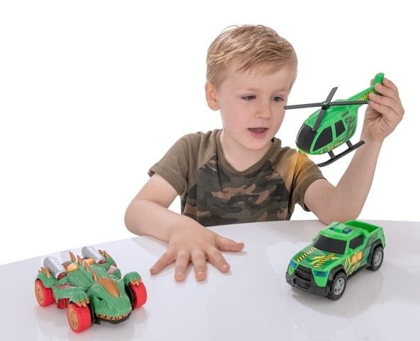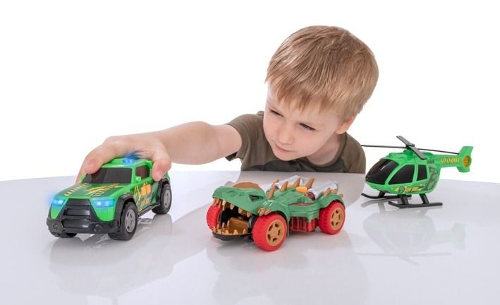 Zažeň dinosaura s touto sadou Teamsterz! Tato sada obsahuje auto Monster Mini Dino s děsivými zvuky monster, zvuky motoru a blikajícími světly, helikoptéru Dino Hunt s ručně otáčejícími se listy vrtule, Dino Hunt pick-up s nouzovými sirénami a světly. Zatlačte podél volně se pohybujícího dinosaura, abyste spustili jeho cvakací čelisti. Perfektní dárek pro každého malého nadšeného řidiče, který nabízí hodiny nápadité zábavy! Vyžaduje 6× LL44 (součástí balení). Vhodné pro věk 3 roky +. Na baterie: 6x LR44 (jsou součástí balení)