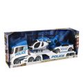 Policejní přepravní auto s helikoptérou a malým autem, které svítí a