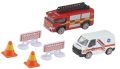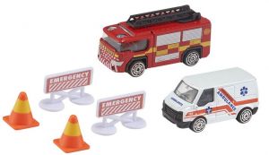 Sada dvou autíček obsahuje ambulanci, hasičské auto, 2 zátarasy a
