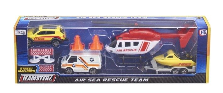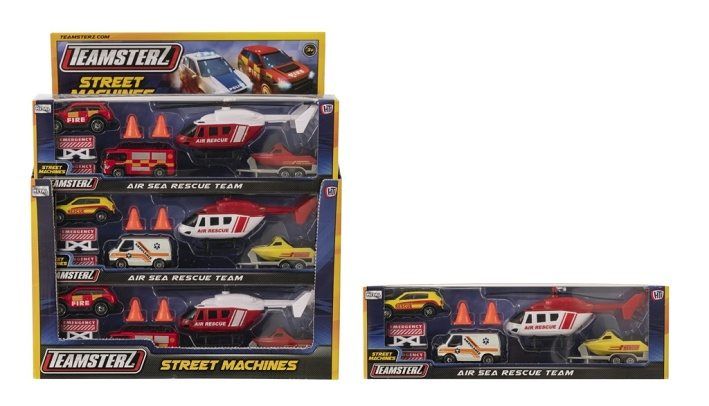 Připravte se na své vlastní záchranné mise na moři. Hrací sada obsahuje vysoce detailní litou helikoptéru s ručně otáčejícími se listy vrtule, zásahové vozidlo, vozidlo 4×4 s tažnou tyčí, plastový člun a odnímatelný přívěs s řadou nouzového silničního příslušenství. Dostupné v sortimentu 2; hasiči a záchranáři a letečtí záchranáři. Perfektní dárek pro každého malého nadšeného řidiče, který nabízí hodiny nápadité zábavy! Napomáhá rozvoji sociálních dovedností, představivosti a jemné motoriky vašich nejmenších, protože mají ideální velikost pro hraní. Tlakově litá vozidla Teamsterz Street Machines mají měřítko přibližně 3 palce a vyznačují se vysoce kvalitním tlakově litým skeletem karoserie a nezávislými volně pohyblivými koly. Vhodné pro věk 3+