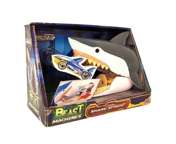 Zatlačte na žraločí hlavu, vypusťte auto z čelistí a sledujte, jak uhání. K dispozici v sortimentu 2 barevných provedení, buď modré nebo šedé, a zahrnuje 1 tlakově litý vůz Beast Machines; další stopu lze přidat z čelisti pro delší hru.Vhodné pro věk 3 roky +.