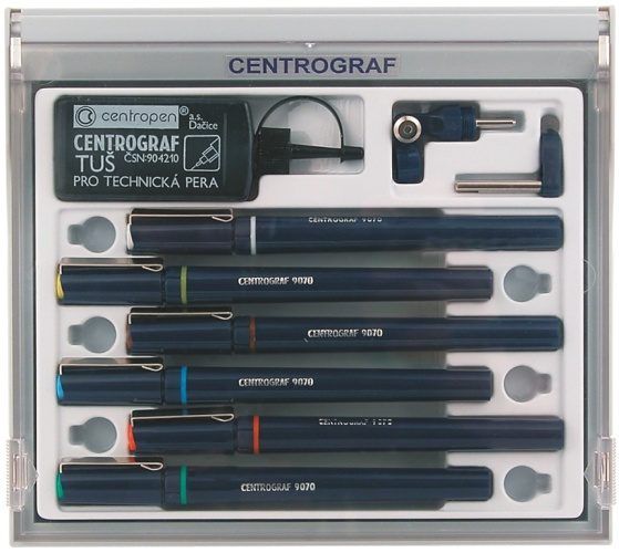 Technická trubičková pera s kvalitní funkčností, odpovídající normám ISO, DIN a?ČSN. Rozměry hrotů: 0,18 - 0,25 - 0,35 - 0,5 - 0,7 - 1,0 - 1,4 mm. Pera jsou vhodná pro studenty i profesionální konstruktéry. SLOŽENÍ SOUPRAV CENTROGRAF 9070 VÝROBEK - ŠÍŘE STOPY V mm 9070/3 - 0,25 - 0,35 - 0,5 9070/4 - 0,25 - 0,35 - 0,5 - 0,7 9070/6 - 0,25 - 0,35 - 0,5 - 0,7 - 1,0 - 1,4 NÁHRADNÍ HROTY VÝROBEK - BAREVNÝ KÓD - TLOUŠŤKA ČÁRY 9070/1-0,18 - čevená - 0,18 mm 9070/1-0,25 - bílá - 0,25 mm 9070/1-0,35 - žlutá - 0,35 mm 9070/1-0,5 - hnědá - 0,50 mm 9070/1-0,7 - modrá - 0,70 mm 9070/1-1,0 - oranžová - 1,00 mm 9070/1-1,4 - zelená - 1,40 mm