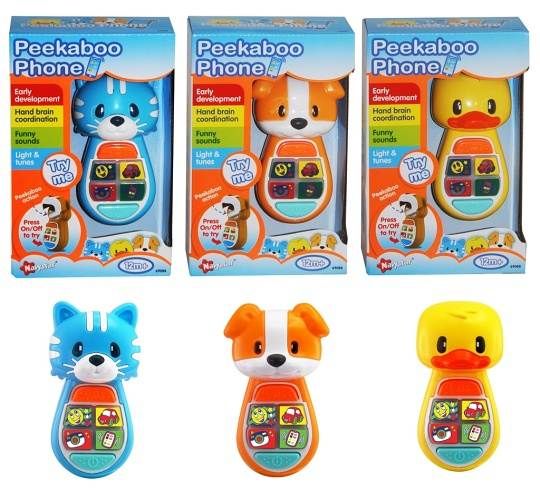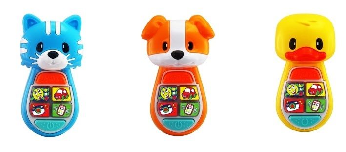 Telefon pro nejmenší v designu 3 různých zvířátek- pejska, kočičky, kachničky. Telefon svítí a vydává zvuky. Hračka má odklapovací hlavičku, stačí zmáčknout tlačítko, pod hlavičkou se nachází zrcátko. Výrobek vyžaduje 2× AG13