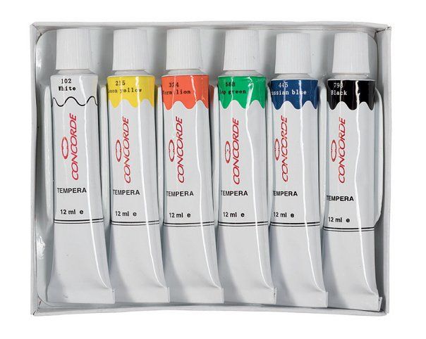 Sada 6-ti temperových barev v kovové tubě. Barvy jsou ředitelné vodou, vzájemně se dobře mísí, po zaschnutí je lze snadno rozmýt. Jsou snadno omyvatelné a vypratelné z většiny textilií. Obsah tuby 12ml.