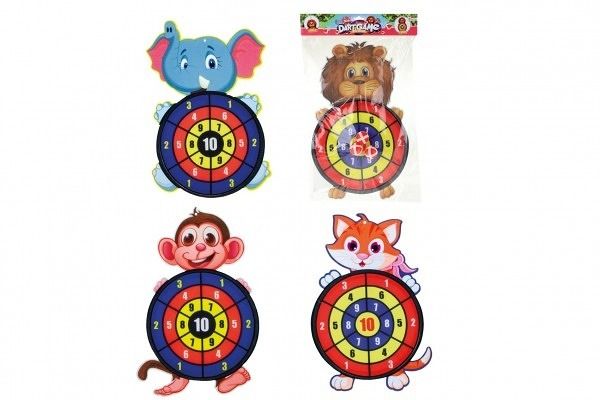 Skvělá zábava pro malé i velké hráče. Vítěz se stanoví podle počtu bodů v jednotlivých polích. Hrát můžete stále dokola a vyzívat nové protivníky. Sada s terčem obsahuje 3ks míčků. Vybrat si můžete ze 4 různých motivů zvířátek s terčem o průměru 27cm.Rozměry výrobku 33 x 54cm.Vhodné pro děti od 4 let.