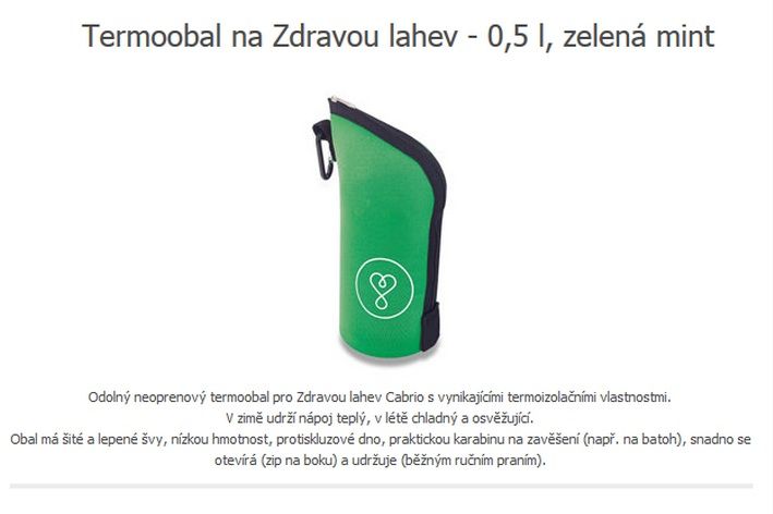 Odolný neoprenový termoobal pro Zdravou lahev Cabrio s vynikajícími termoizolačními vlastnostmi. V zimě udrží nápoj teplý, v létě chladný a osvěžující. V zimě udrží nápoj teplý, v létě chladný a osvěžující. Obal má šité a lepené švy, nízkou hmotnost, protiskluzové dno, praktickou karabinu na zavěšení (např. na batoh), snadno se otevírá (zip na boku) a udržuje (běžným ručním praním). Navíc má nadčasový design, který se neomrzí. (ZDRL-T-0,5L)