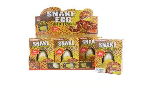 Tesání hadího vejce. Každé balení obsahuje vejce s hadem uvnitř, který svítí ve tmě a 2 tesací dláta. Rozměr malého balení cca 15 x 12 x 5 cm.