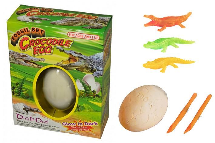 Tesání korokodýlí vejce. Každé balení obsahuje vejce s krokodýlem uvnitř, který svítí ve tmě a 2 tesací dláta.