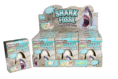 Tesání vejce žraloka. Každé balení obsahuje vejce se žralokem uvnitř, který svítí ve tmě a 2 tesací dláta. Rozměr malého balení cca 15 x 12 x 5 cm.