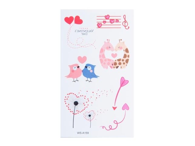 Tetovací obtisky - láska. Vytvořte si originální tetování pomocí tetovaček! NÁVOD: 1. Vystřihněte zvolený motiv a odstraňte krycí fólii. 2. Obrázek přitiskněte na čistou suchou pokožku. 3. Shora vodou navlhčete podkladový papír obrázku, přidržte 20 sekund na pokožce a pak ho opatrně sejměte. 4. Obrázek nechejte 60 sekund zaschnout. Tetování lze odstranit pomocí lihu, krému, běžným mytím nebo dětským olejíčkem. Uvedená cena je za 1 aršík.