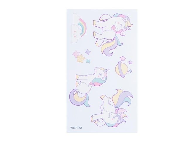 Tetovací obtisky - tři jednorožci. Tetovací obtisky jednorožci. Jsou vhodné na dětské oslavy, párty, karnevaly nebo jako dárek přátelům. NÁVOD: 1. Vystřihněte zvolený motiv a odstraňte krycí fólii. 2. Obrázek přitiskněte na čistou suchou pokožku. 3. Shora vodou navlhčete podkladový papír obrázku, přidržte 20 sekund na pokožce a pak ho opatrně sejměte. 4. Obrázek nechejte 60 sekund zaschnout. Tetování lze odstranit pomocí lihu, krému, běžným mytím nebo dětským olejíčkem. Uvedená cena je za 1 aršík.