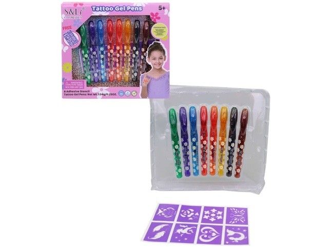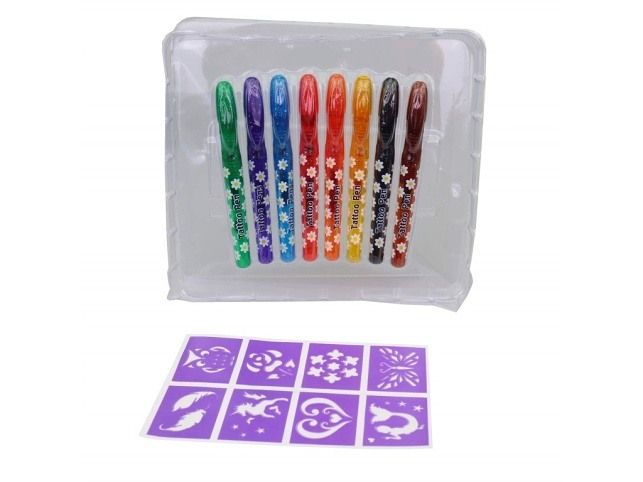Tetovací pera 8 barev, 22 x 3 x 20 cm, vytvoř si vlastní originál obrázek kdekoli na svém těle k dispozici k tomu máš 8 tetovacích barev. Určitě si vybereš svou oblíbenou. Aplikace je velmi snadná jako malování tužkou. Součástí balení je 8 lepících šablon pro dokonalý vzhled konečného obrázku. Doporučený věk 5+. Rozměr balení: 22 x 3 x 20 cm.
